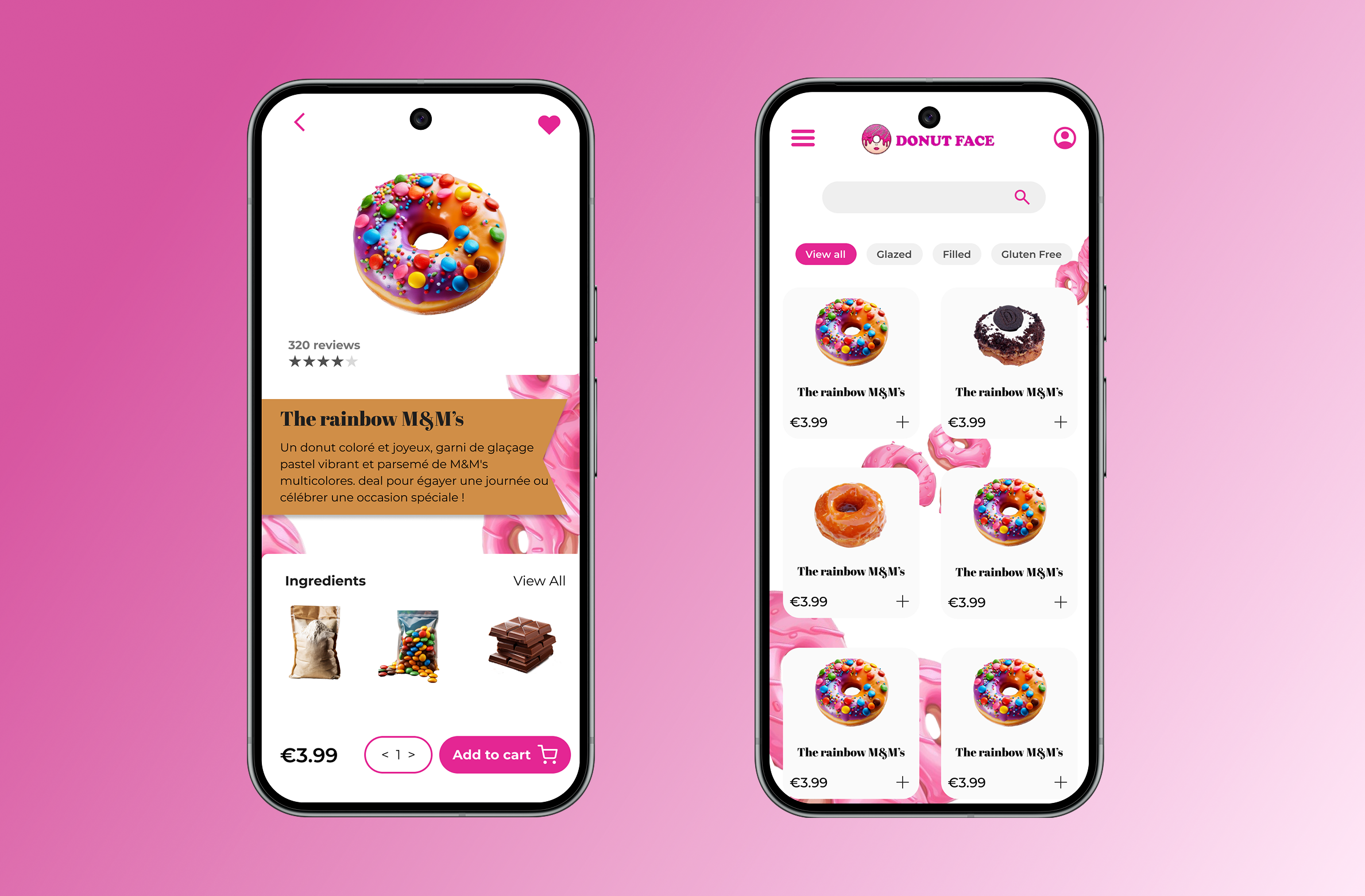 DonutFace is an e-commerce project for a donut brand. I invented the brand from scratch, I designed the logo in Illustrator and developed the website layout in Figma.